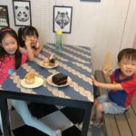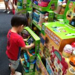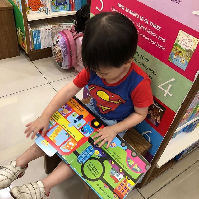 Jie jie checking out books, he checking out toys only